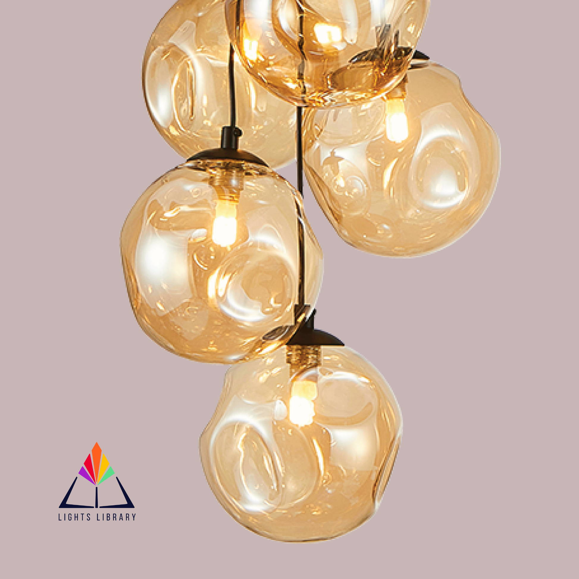 The Amber Glow Cluster Hanging Light exudes warmth and elegance, featuring a cascading arrangement of amber glass spheres for a captivating ambiance.