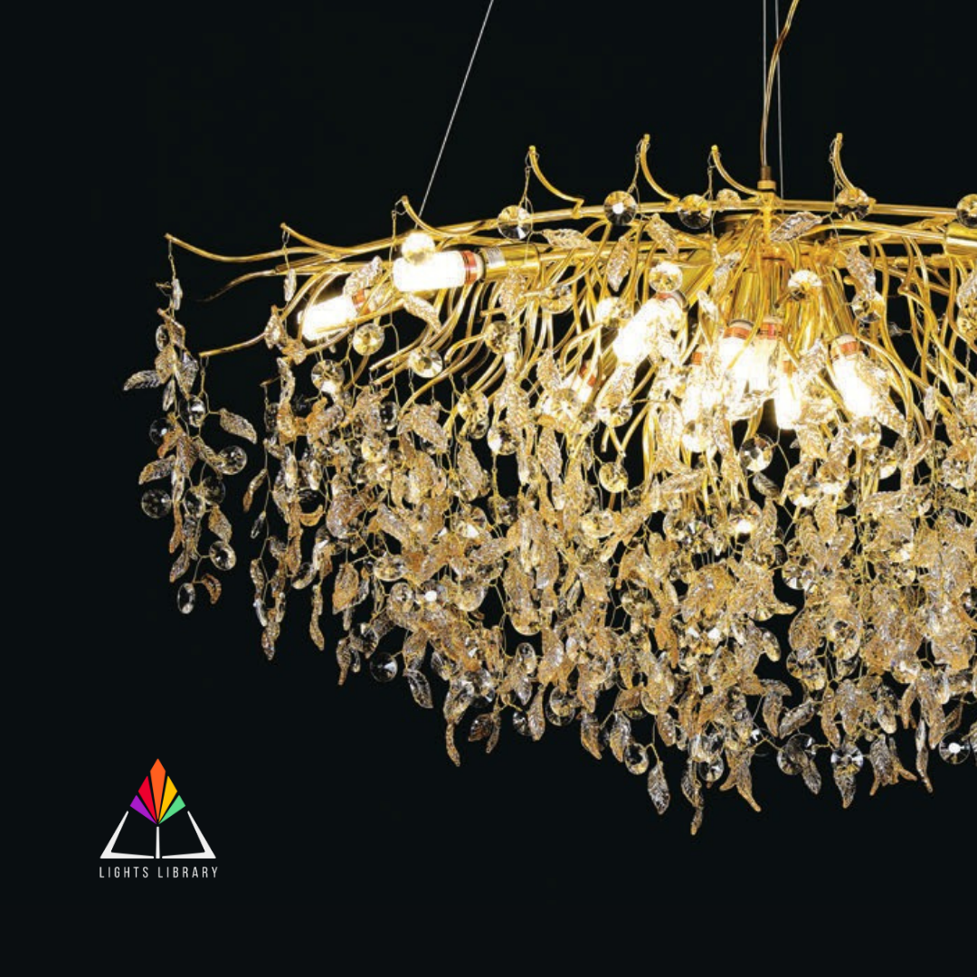 The Golden Bloom chandelier captures the beauty of cascading crystal leaves intertwined with golden branches. Designed to create a mesmerizing ambiance, this masterpiece adds a touch of grandeur to luxury interiors, hotels, and upscale dining areas. A perfect fusion of organic elegance and refined craftsmanship for an opulent atmosphere.