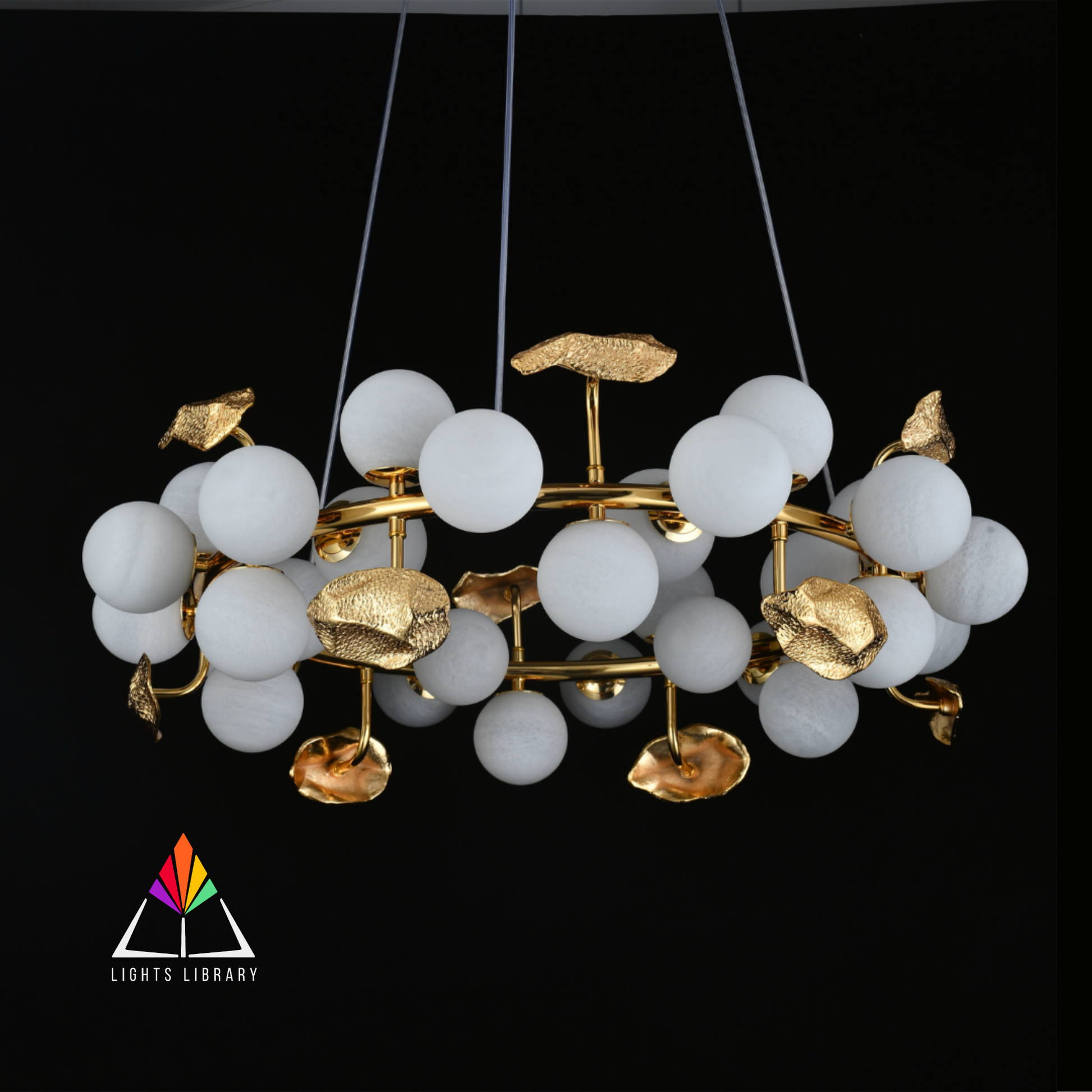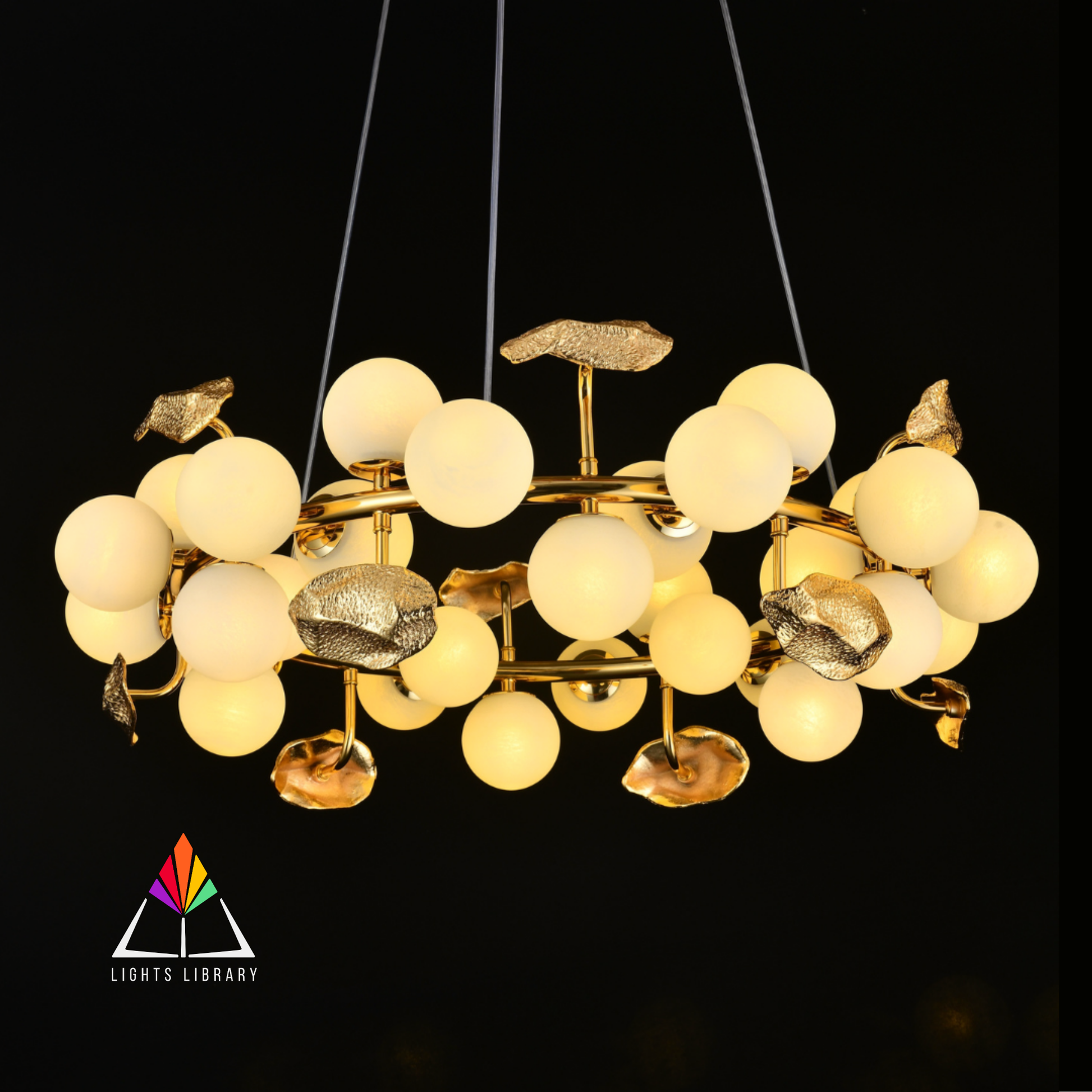 The Golden Orbit Chandelier features a celestial arrangement of frosted glass spheres and golden accents, creating a warm and artistic ambiance.