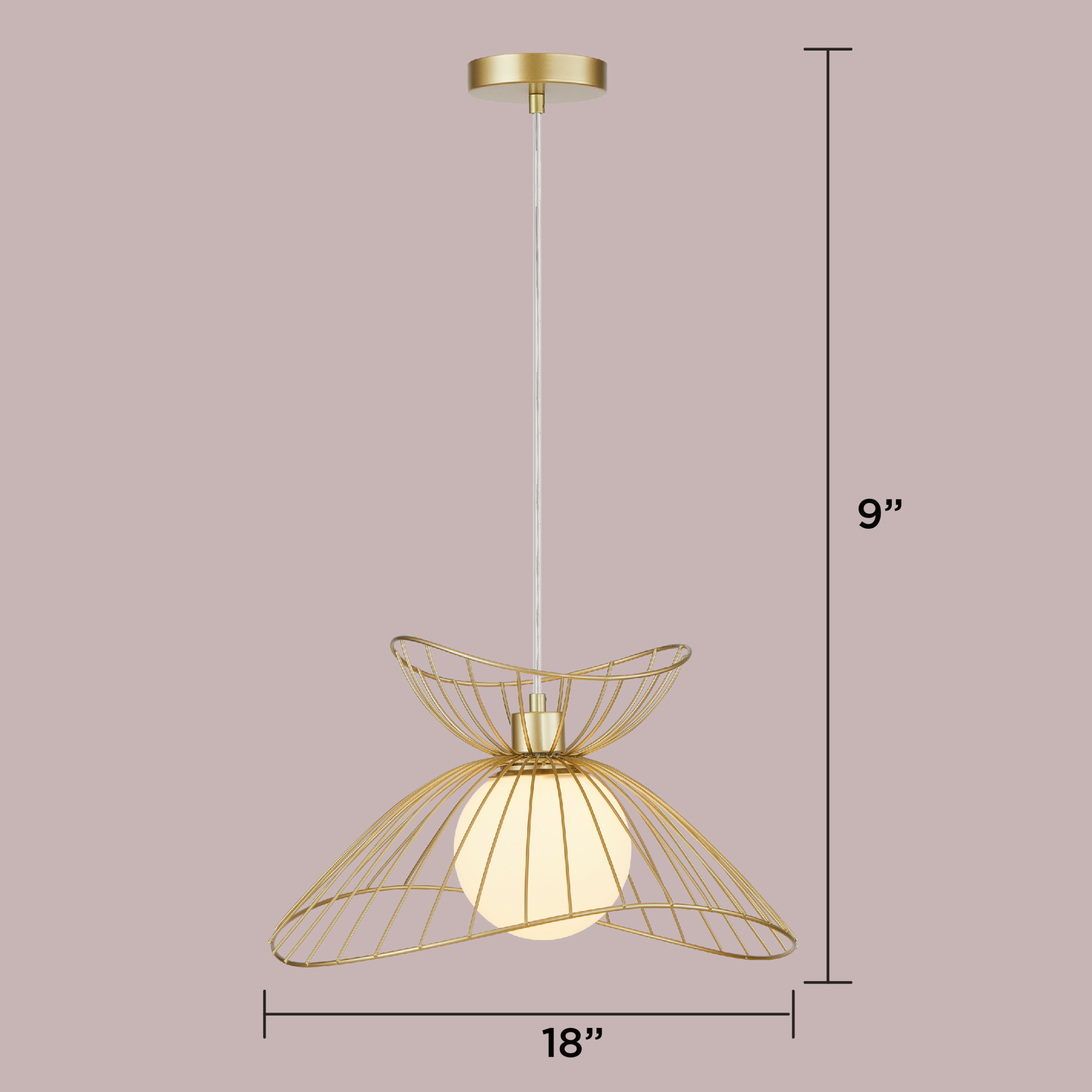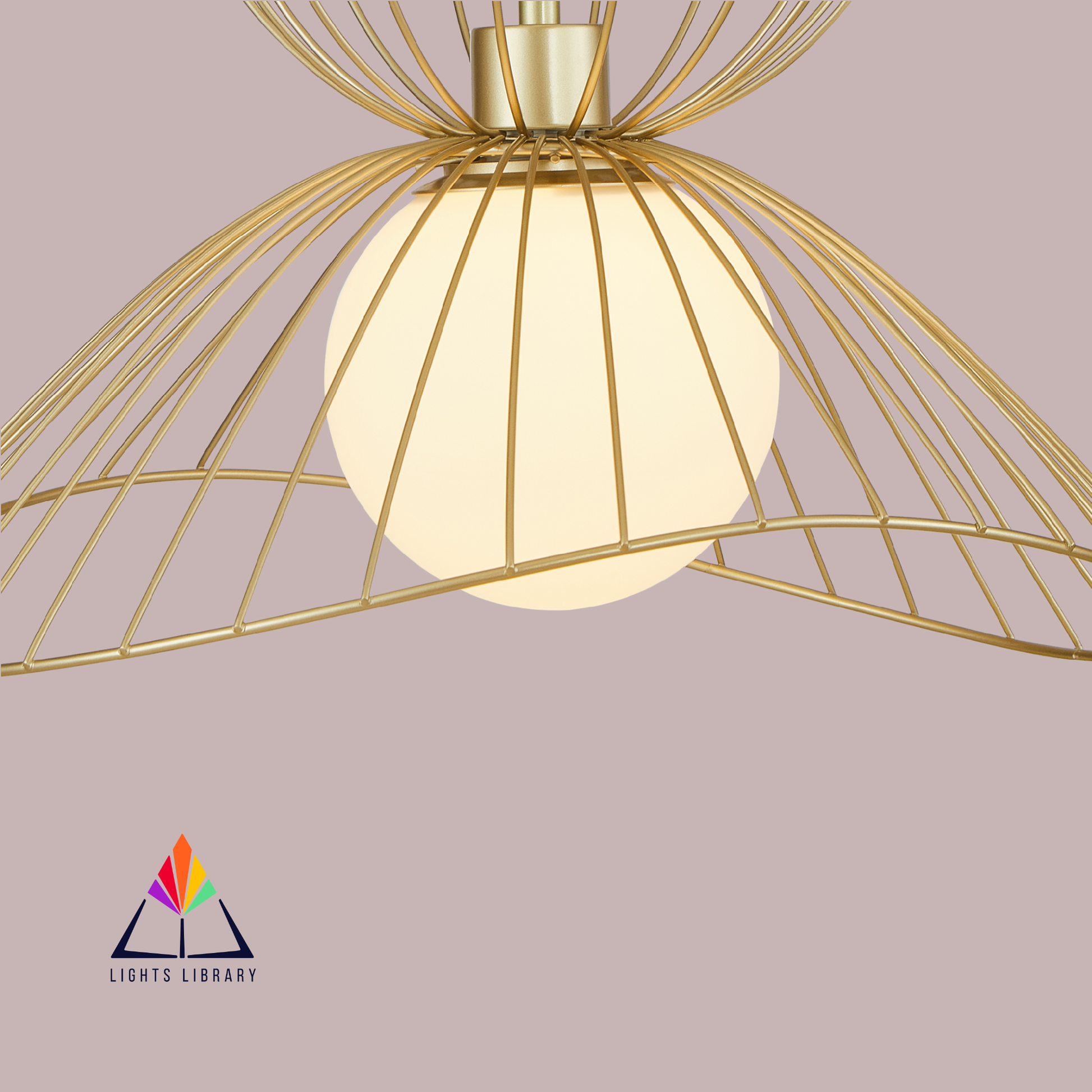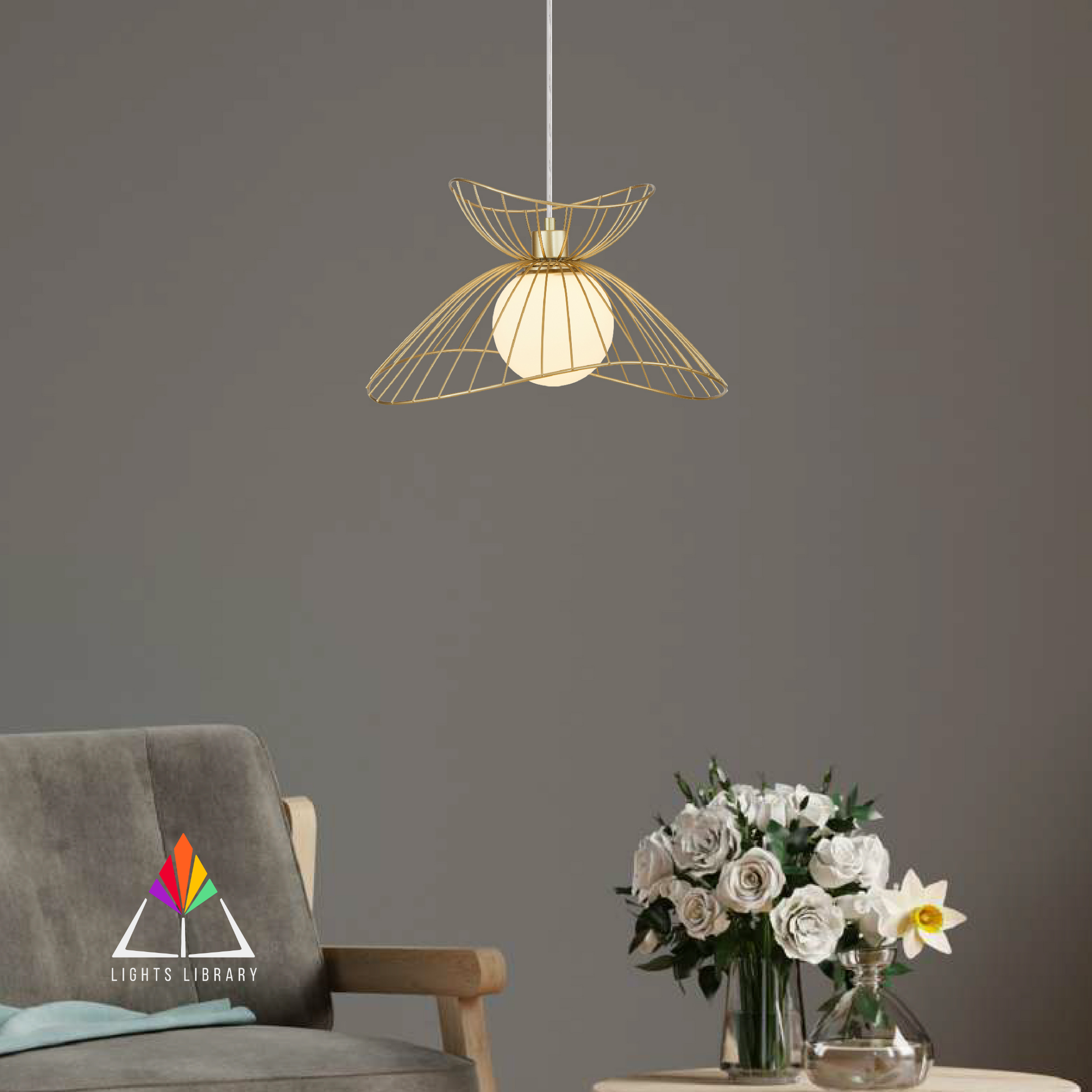 The Golden Petal Pendant Light features an elegant, petal-inspired wireframe design with a frosted globe, creating a modern artistic ambiance.