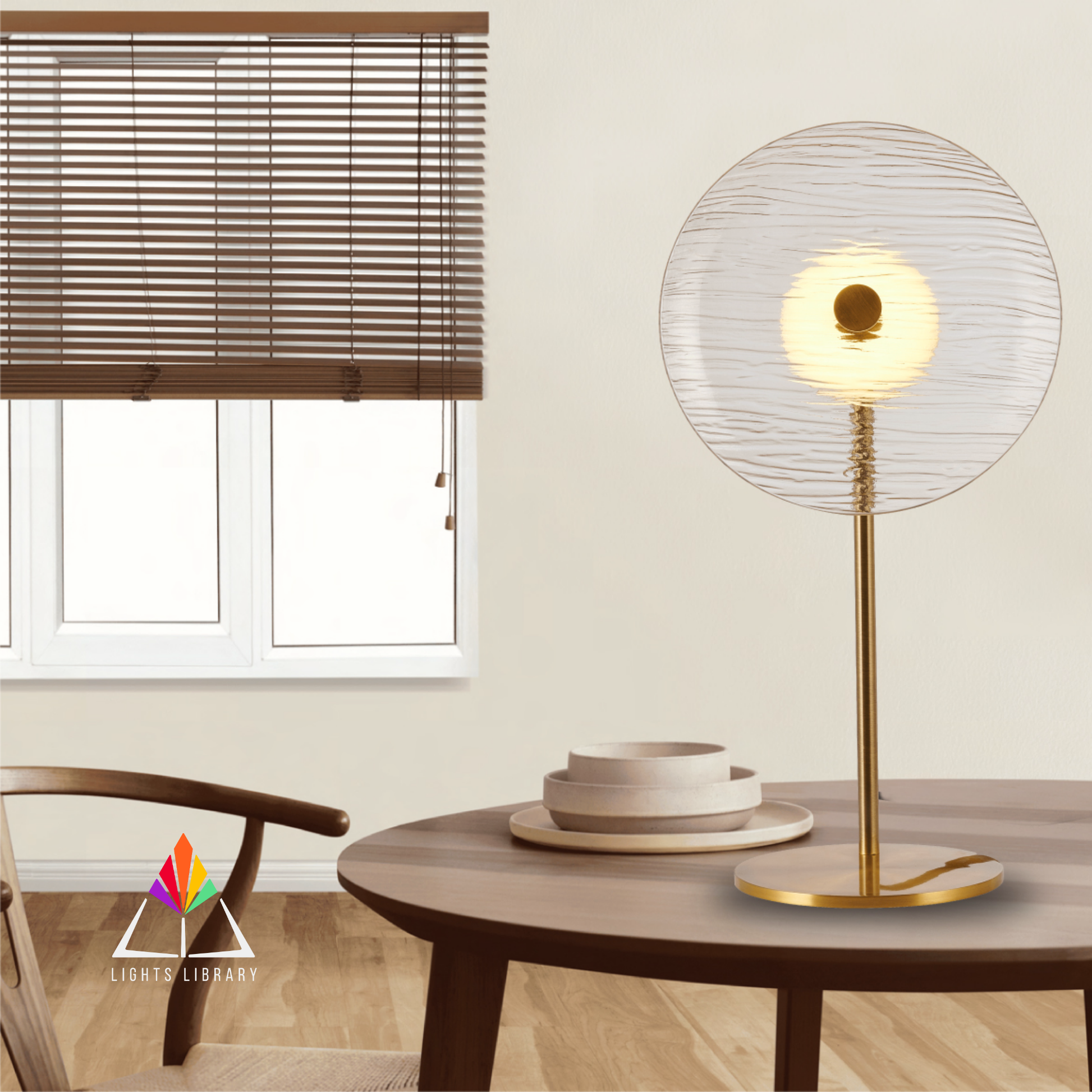 The Luminous Disc Table Lamp features a textured glass disc and sleek brass base, creating a captivating and elegant ambiance.