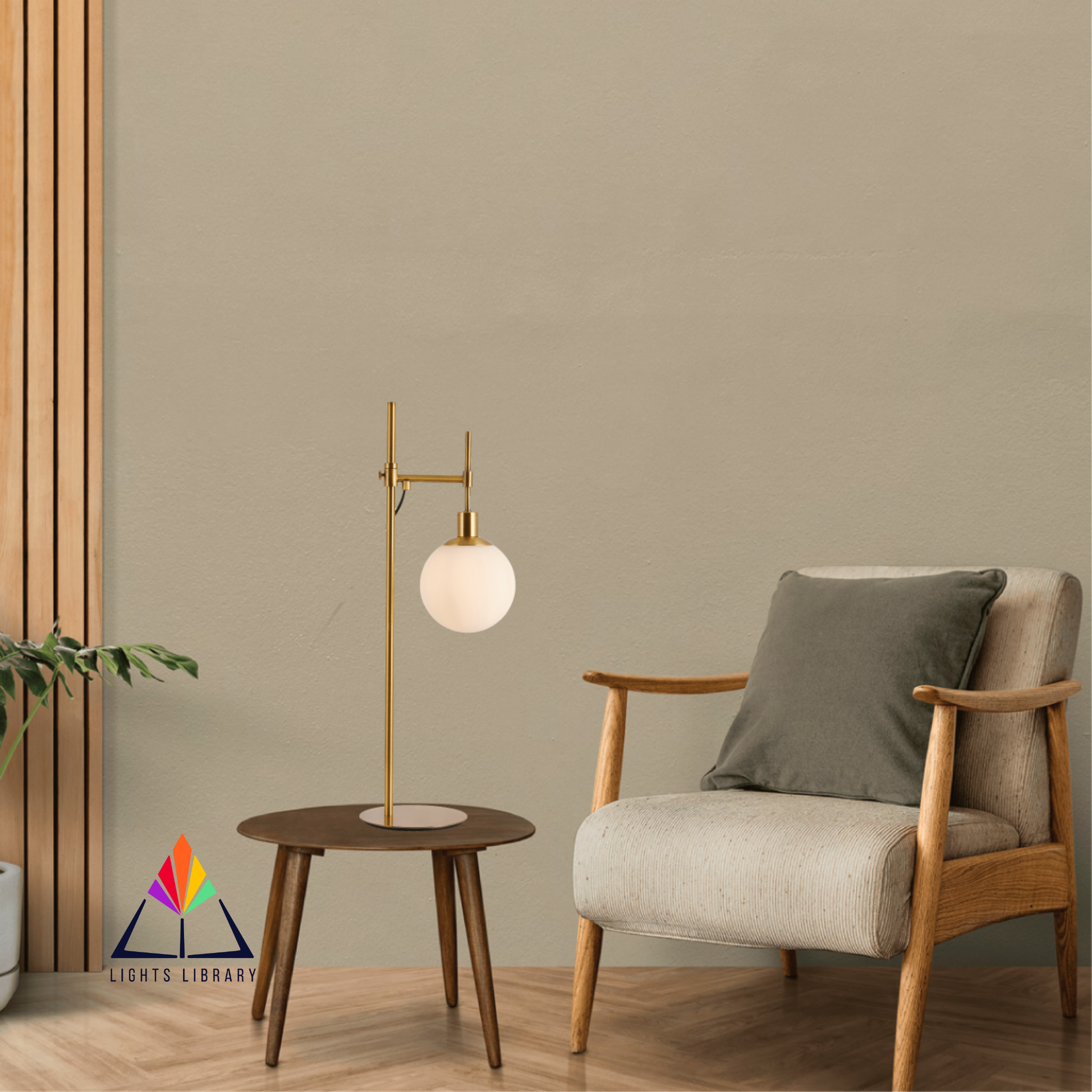 The Radiant Globe Table Lamp features a brass finish and frosted glass shade, offering an elegant touch to any setting.