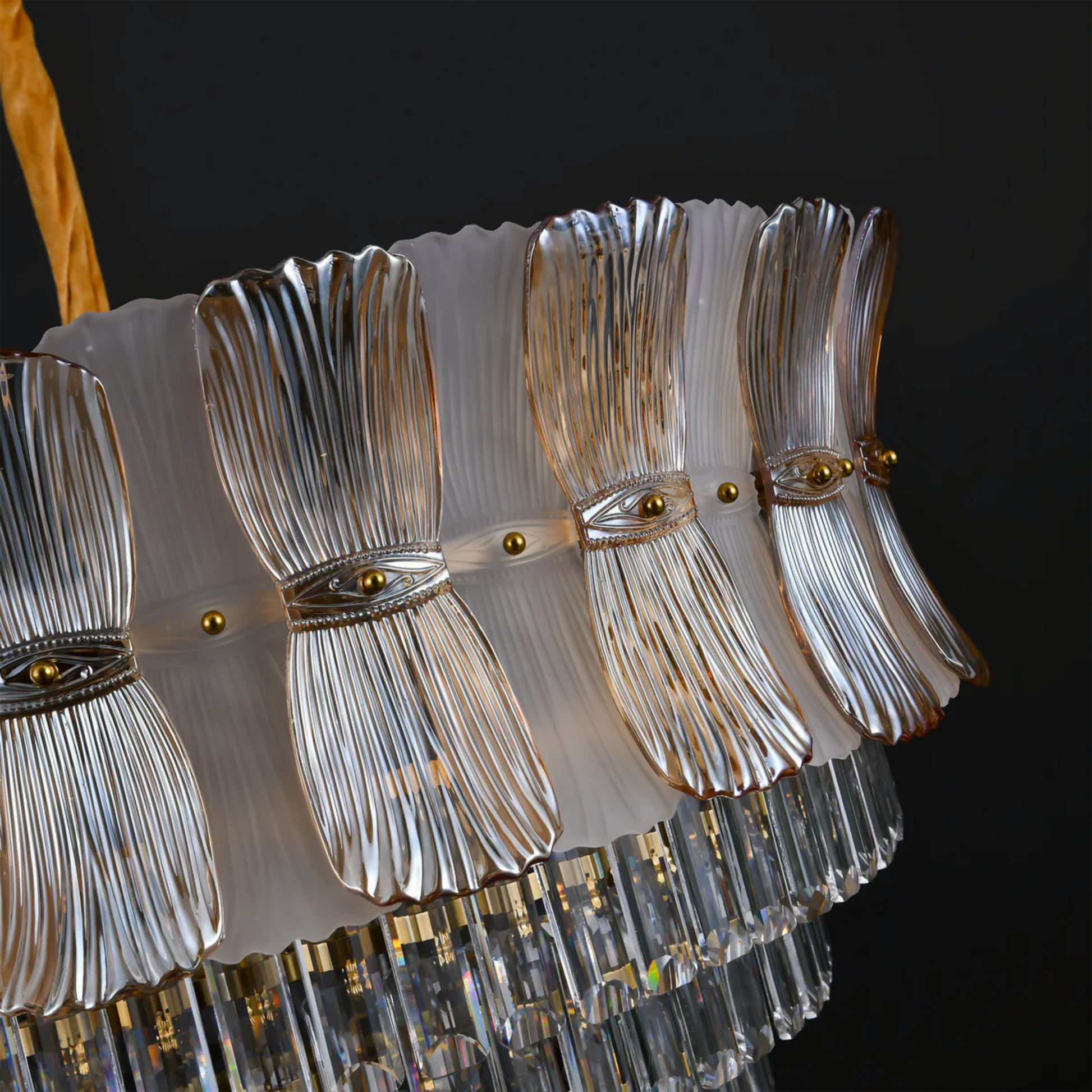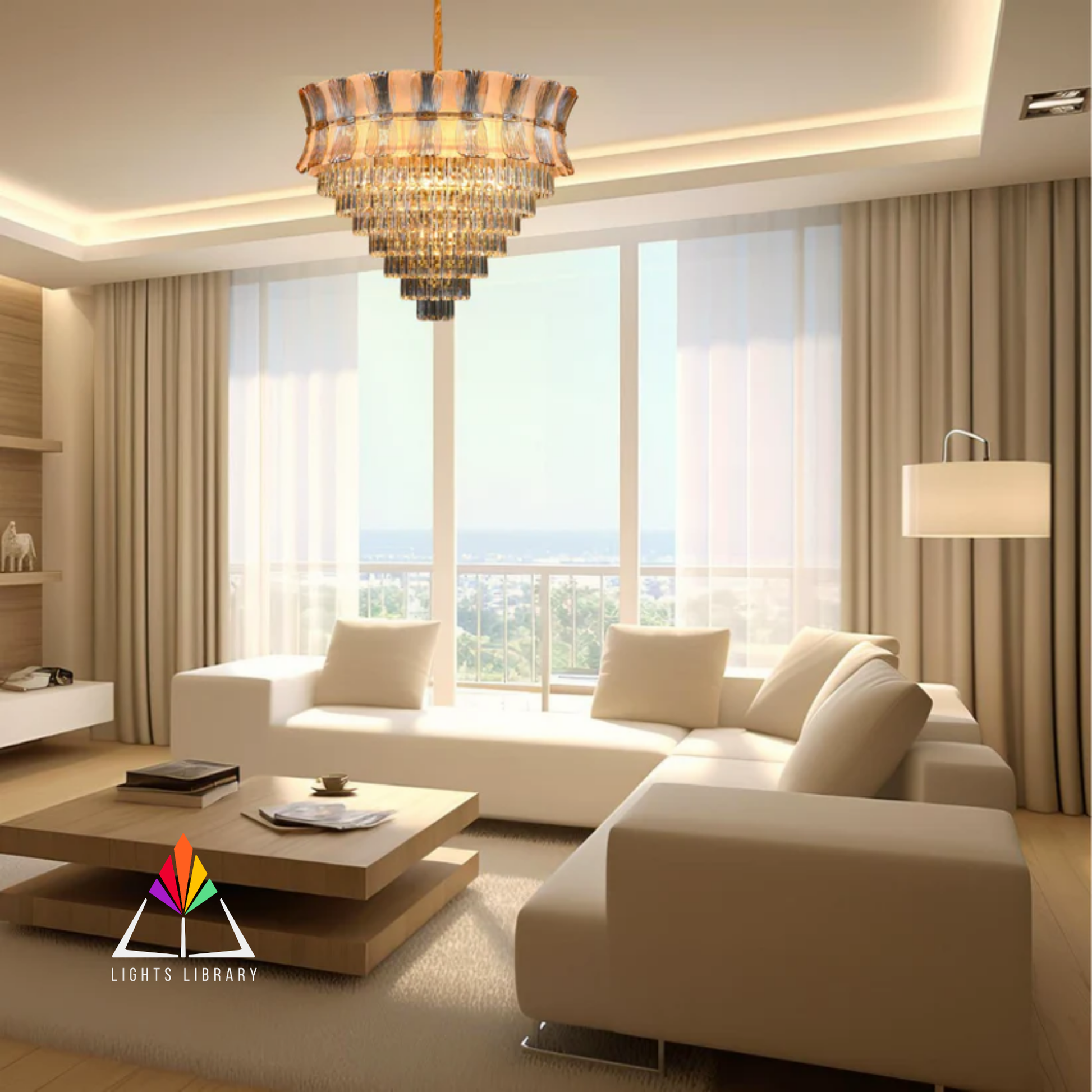 The Regal Bloom Chandelier showcases layered crystal petals and cascading prisms, adding an elegant and luxurious focal point to any room.