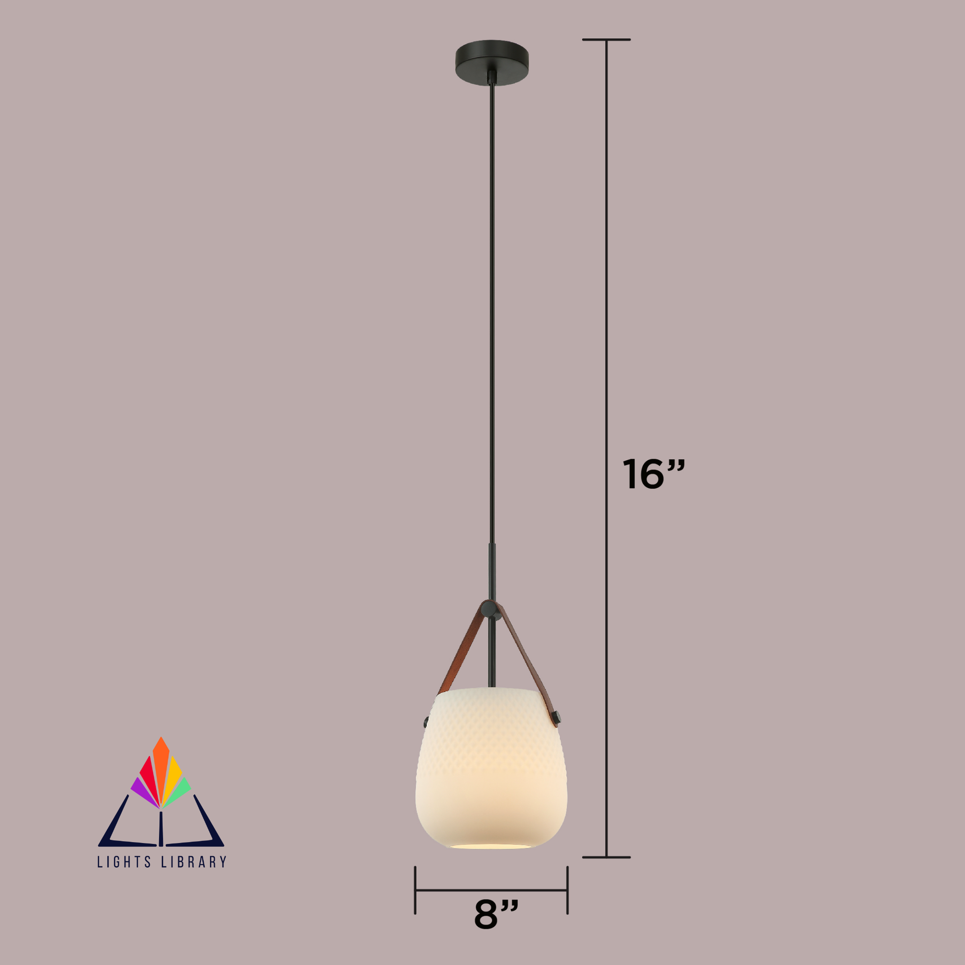 The Textured Ceramic Pendant Light features a warm, frosted ceramic shade with a leather strap accent, adding cozy elegance to any space.